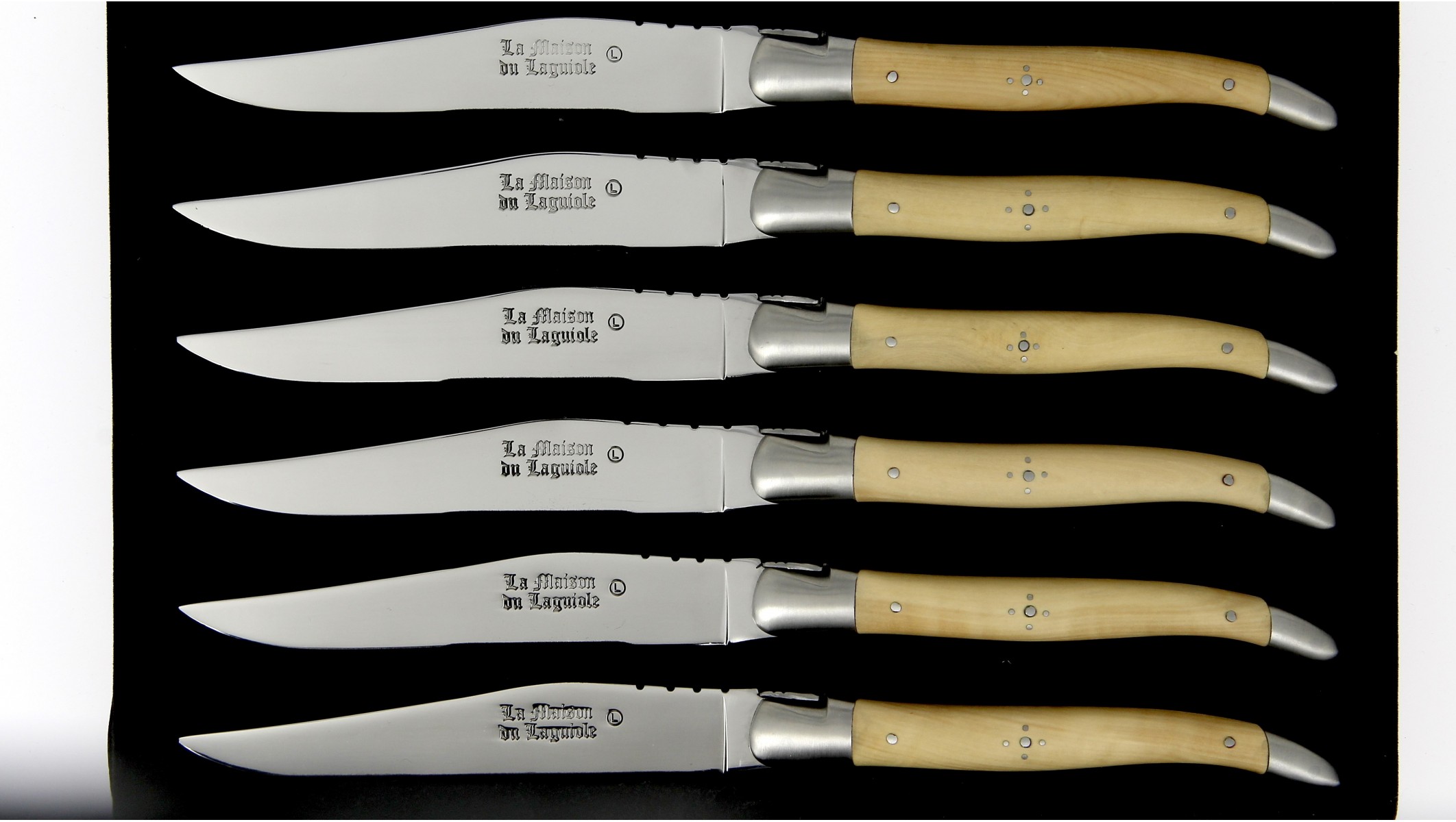 Coffret de six couteaux de table de Laguiole, mitres en inox brossé, manche en Buis.