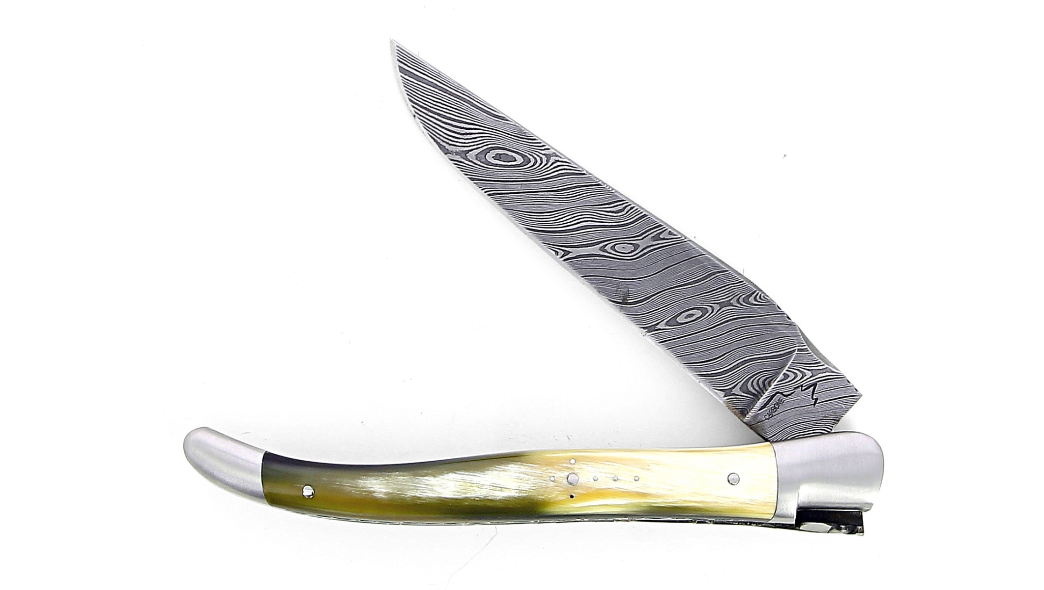 Couteau Laguiole 13 cm, mitres inox brossé, double platine, mitres inox, en corne de vache Aubrac, lame damas carbone.