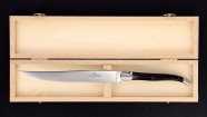 Ce couteau à découper de Laguiole est doté d'une manche en corne de vache Aubrac protégé par deux mitres en inox brossé. La corne de vache Aubrac, provient des vaches aveyronnaises de race Aubrac. Matière traditionnelle du couteau de Laguiole, la corne de vache Aubrac est composée de nuances sombres parfois rehaussées de tâches aux teintes vertes, noires ou blanches. La corne de vache Aubrac saura ravir les amateurs de l'authentique couteau de Laguiole. Ce couteau à découper de Laguiole est équipé d'une longue lame finement affûtée. Il est destiné à la découpe de viande et de volailles.